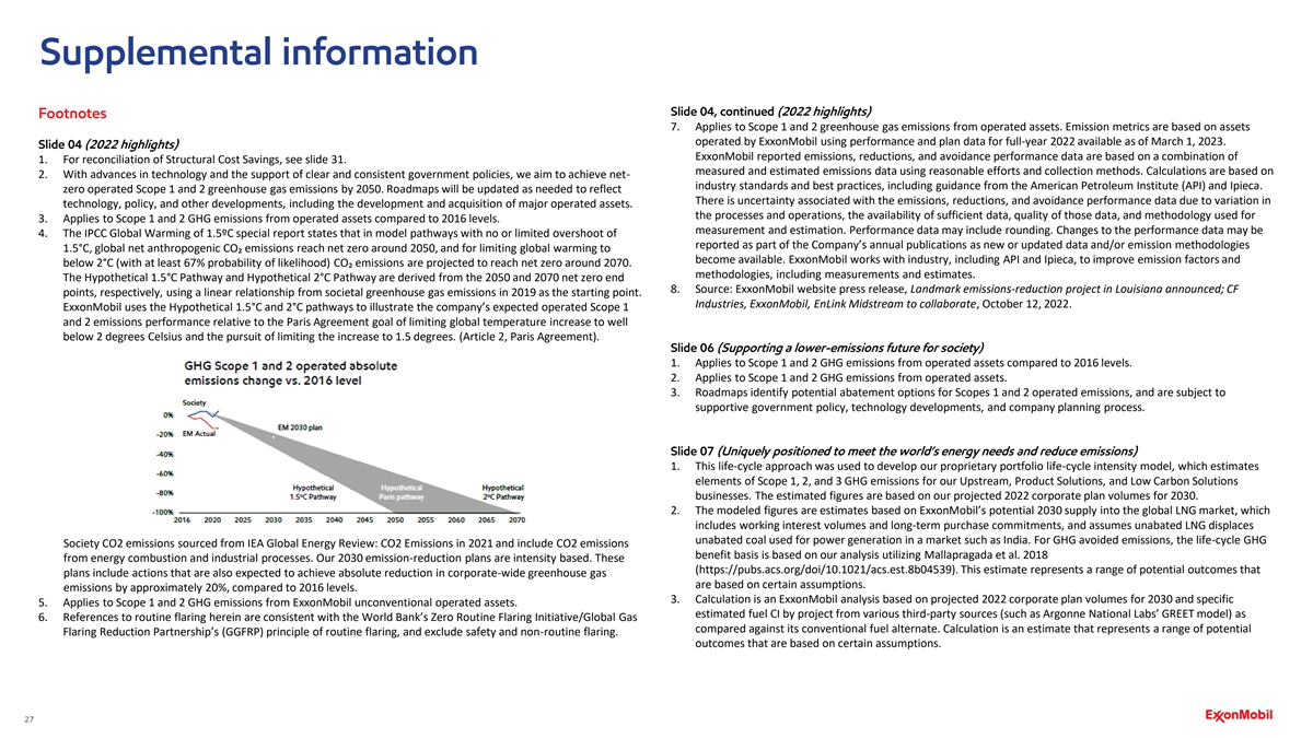 Supplemental information Slide 04, continued (2022 highlights) Footnotes 7. Applies to Scope 1 and 2 greenhouse gas emissions from operated assets. Emission metrics are based on assets operated by ExxonMobil using performance and plan data for full-year 2022 available as of March 1, 2023. Slide 04 (2022 highlights) ExxonMobil reported emissions, reductions, and avoidance performance data are based on a combination of 1. For reconciliation of Structural Cost Savings, see slide 31. measured and estimated emissions data using reasonable efforts and collection methods. Calculations are based on 2. With advances in technology and the support of clear and consistent government policies, we aim to achieve net- industry standards and best practices, including guidance from the American Petroleum Institute (API) and Ipieca. zero operated Scope 1 and 2 greenhouse gas emissions by 2050. Roadmaps will be updated as needed to reflect There is uncertainty associated with the emissions, reductions, and avoidance performance data due to variation in technology, policy, and other developments, including the development and acquisition of major operated assets. the processes and operations, the availability of sufficient data, quality of those data, and methodology used for 3. Applies to Scope 1 and 2 GHG emissions from operated assets compared to 2016 levels. measurement and estimation. Performance data may include rounding. Changes to the performance data may be 4. The IPCC Global Warming of 1.5ºC special report states that in model pathways with no or limited overshoot of reported as part of the Company’s annual publications as new or updated data and/or emission methodologies 1.5°C, global net anthropogenic CO₂ emissions reach net zero around 2050, and for limiting global warming to become available. ExxonMobil works with industry, including API and Ipieca, to improve emission factors and below 2°C (with at least 67% probability of likelihood) CO₂ emissions are projected to reach net zero around 2070. methodologies, including measurements and estimates. The Hypothetical 1.5°C Pathway and Hypothetical 2°C Pathway are derived from the 2050 and 2070 net zero end 8. Source: ExxonMobil website press release, Landmark emissions-reduction project in Louisiana announced; CF points, respectively, using a linear relationship from societal greenhouse gas emissions in 2019 as the starting point. Industries, ExxonMobil, EnLink Midstream to collaborate, October 12, 2022. ExxonMobil uses the Hypothetical 1.5°C and 2°C pathways to illustrate the company’s expected operated Scope 1 and 2 emissions performance relative to the Paris Agreement goal of limiting global temperature increase to well below 2 degrees Celsius and the pursuit of limiting the increase to 1.5 degrees. (Article 2, Paris Agreement). Slide 06 (Supporting a lower-emissions future for society) 1. Applies to Scope 1 and 2 GHG emissions from operated assets compared to 2016 levels. 2. Applies to Scope 1 and 2 GHG emissions from operated assets. 3. Roadmaps identify potential abatement options for Scopes 1 and 2 operated emissions, and are subject to supportive government policy, technology developments, and company planning process. Slide 07 (Uniquely positioned to meet the world’s energy needs and reduce emissions) 1. This life-cycle approach was used to develop our proprietary portfolio life-cycle intensity model, which estimates elements of Scope 1, 2, and 3 GHG emissions for our Upstream, Product Solutions, and Low Carbon Solutions businesses. The estimated figures are based on our projected 2022 corporate plan volumes for 2030. 2. The modeled figures are estimates based on ExxonMobil’s potential 2030 supply into the global LNG market, which includes working interest volumes and long-term purchase commitments, and assumes unabated LNG displaces unabated coal used for power generation in a market such as India. For GHG avoided emissions, the life-cycle GHG Society CO2 emissions sourced from IEA Global Energy Review: CO2 Emissions in 2021 and include CO2 emissions benefit basis is based on our analysis utilizing Mallapragada et al. 2018 from energy combustion and industrial processes. Our 2030 emission-reduction plans are intensity based. These (https://pubs.acs.org/doi/10.1021/acs.est.8b04539). This estimate represents a range of potential outcomes that plans include actions that are also expected to achieve absolute reduction in corporate-wide greenhouse gas are based on certain assumptions. emissions by approximately 20%, compared to 2016 levels. 3. Calculation is an ExxonMobil analysis based on projected 2022 corporate plan volumes for 2030 and specific 5. Applies to Scope 1 and 2 GHG emissions from ExxonMobil unconventional operated assets. estimated fuel CI by project from various third-party sources (such as Argonne National Labs’ GREET model) as 6. References to routine flaring herein are consistent with the World Bank’s Zero Routine Flaring Initiative/Global Gas compared against its conventional fuel alternate. Calculation is an estimate that represents a range of potential Flaring Reduction Partnership’s (GGFRP) principle of routine flaring, and exclude safety and non-routine flaring. outcomes that are based on certain assumptions. 27