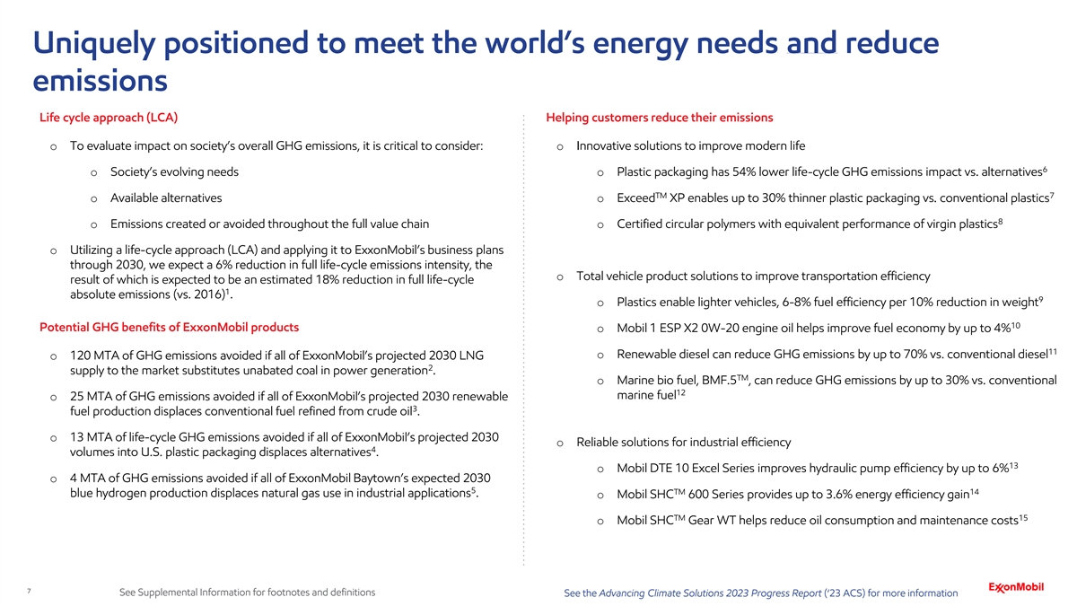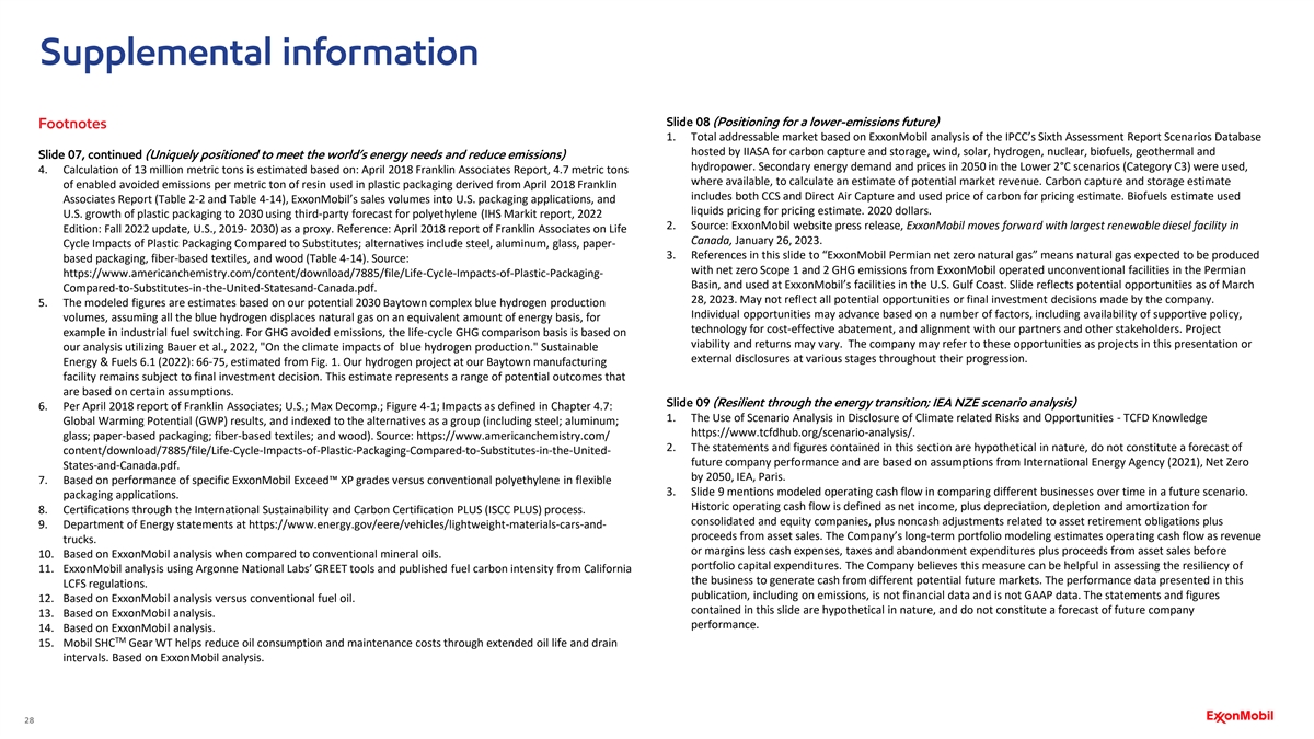 Supplemental information Slide 08 (Positioning for a lower-emissions future) Footnotes 1. Total addressable market based on ExxonMobil analysis of the IPCC’s Sixth Assessment Report Scenarios Database hosted by IIASA for carbon capture and storage, wind, solar, hydrogen, nuclear, biofuels, geothermal and Slide 07, continued (Uniquely positioned to meet the world’s energy needs and reduce emissions) hydropower. Secondary energy demand and prices in 2050 in the Lower 2°C scenarios (Category C3) were used, 4. Calculation of 13 million metric tons is estimated based on: April 2018 Franklin Associates Report, 4.7 metric tons where available, to calculate an estimate of potential market revenue. Carbon capture and storage estimate of enabled avoided emissions per metric ton of resin used in plastic packaging derived from April 2018 Franklin includes both CCS and Direct Air Capture and used price of carbon for pricing estimate. Biofuels estimate used Associates Report (Table 2-2 and Table 4-14), ExxonMobil’s sales volumes into U.S. packaging applications, and liquids pricing for pricing estimate. 2020 dollars. U.S. growth of plastic packaging to 2030 using third-party forecast for polyethylene (IHS Markit report, 2022 2. Source: ExxonMobil website press release, ExxonMobil moves forward with largest renewable diesel facility in Edition: Fall 2022 update, U.S., 2019- 2030) as a proxy. Reference: April 2018 report of Franklin Associates on Life Canada, January 26, 2023. Cycle Impacts of Plastic Packaging Compared to Substitutes; alternatives include steel, aluminum, glass, paper- 3. References in this slide to “ExxonMobil Permian net zero natural gas” means natural gas expected to be produced based packaging, fiber-based textiles, and wood (Table 4-14). Source: with net zero Scope 1 and 2 GHG emissions from ExxonMobil operated unconventional facilities in the Permian https://www.americanchemistry.com/content/download/7885/file/Life-Cycle-Impacts-of-Plastic-Packaging- Basin, and used at ExxonMobil’s facilities in the U.S. Gulf Coast. Slide reflects potential opportunities as of March Compared-to-Substitutes-in-the-United-Statesand-Canada.pdf. 28, 2023. May not reflect all potential opportunities or final investment decisions made by the company. 5. The modeled figures are estimates based on our potential 2030 Baytown complex blue hydrogen production Individual opportunities may advance based on a number of factors, including availability of supportive policy, volumes, assuming all the blue hydrogen displaces natural gas on an equivalent amount of energy basis, for technology for cost-effective abatement, and alignment with our partners and other stakeholders. Project example in industrial fuel switching. For GHG avoided emissions, the life-cycle GHG comparison basis is based on viability and returns may vary. The company may refer to these opportunities as projects in this presentation or our analysis utilizing Bauer et al., 2022, On the climate impacts of blue hydrogen production. Sustainable external disclosures at various stages throughout their progression. Energy & Fuels 6.1 (2022): 66-75, estimated from Fig. 1. Our hydrogen project at our Baytown manufacturing facility remains subject to final investment decision. This estimate represents a range of potential outcomes that are based on certain assumptions. Slide 09 (Resilient through the energy transition; IEA NZE scenario analysis) 6. Per April 2018 report of Franklin Associates; U.S.; Max Decomp.; Figure 4-1; Impacts as defined in Chapter 4.7: 1. The Use of Scenario Analysis in Disclosure of Climate related Risks and Opportunities - TCFD Knowledge Global Warming Potential (GWP) results, and indexed to the alternatives as a group (including steel; aluminum; https://www.tcfdhub.org/scenario-analysis/. glass; paper-based packaging; fiber-based textiles; and wood). Source: https://www.americanchemistry.com/ 2. The statements and figures contained in this section are hypothetical in nature, do not constitute a forecast of content/download/7885/file/Life-Cycle-Impacts-of-Plastic-Packaging-Compared-to-Substitutes-in-the-United- future company performance and are based on assumptions from International Energy Agency (2021), Net Zero States-and-Canada.pdf. by 2050, IEA, Paris. 7. Based on performance of specific ExxonMobil Exceed™ XP grades versus conventional polyethylene in flexible 3. Slide 9 mentions modeled operating cash flow in comparing different businesses over time in a future scenario. packaging applications. Historic operating cash flow is defined as net income, plus depreciation, depletion and amortization for 8. Certifications through the International Sustainability and Carbon Certification PLUS (ISCC PLUS) process. consolidated and equity companies, plus noncash adjustments related to asset retirement obligations plus 9. Department of Energy statements at https://www.energy.gov/eere/vehicles/lightweight-materials-cars-and- proceeds from asset sales. The Company’s long-term portfolio modeling estimates operating cash flow as revenue trucks. or margins less cash expenses, taxes and abandonment expenditures plus proceeds from asset sales before 10. Based on ExxonMobil analysis when compared to conventional mineral oils. portfolio capital expenditures. The Company believes this measure can be helpful in assessing the resiliency of 11. ExxonMobil analysis using Argonne National Labs’ GREET tools and published fuel carbon intensity from California the business to generate cash from different potential future markets. The performance data presented in this LCFS regulations. publication, including on emissions, is not financial data and is not GAAP data. The statements and figures 12. Based on ExxonMobil analysis versus conventional fuel oil. contained in this slide are hypothetical in nature, and do not constitute a forecast of future company 13. Based on ExxonMobil analysis. performance. 14. Based on ExxonMobil analysis