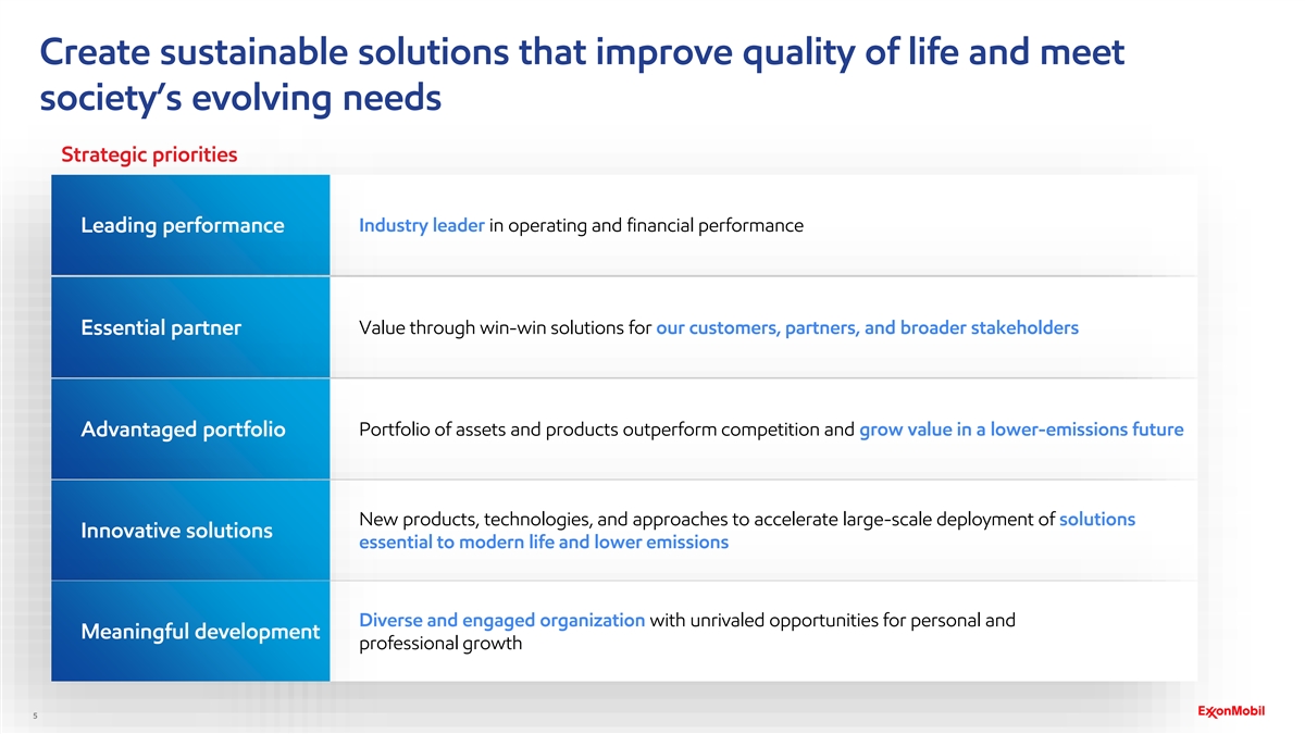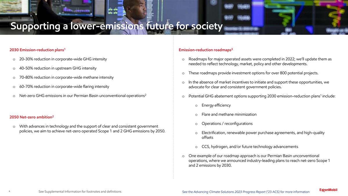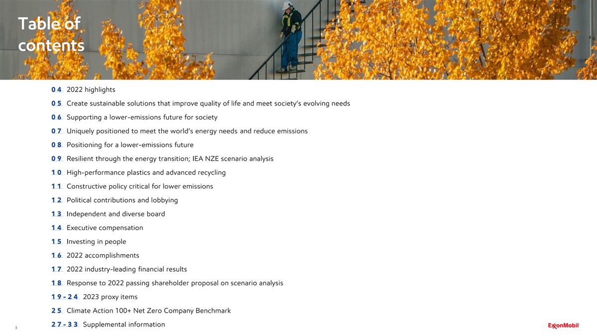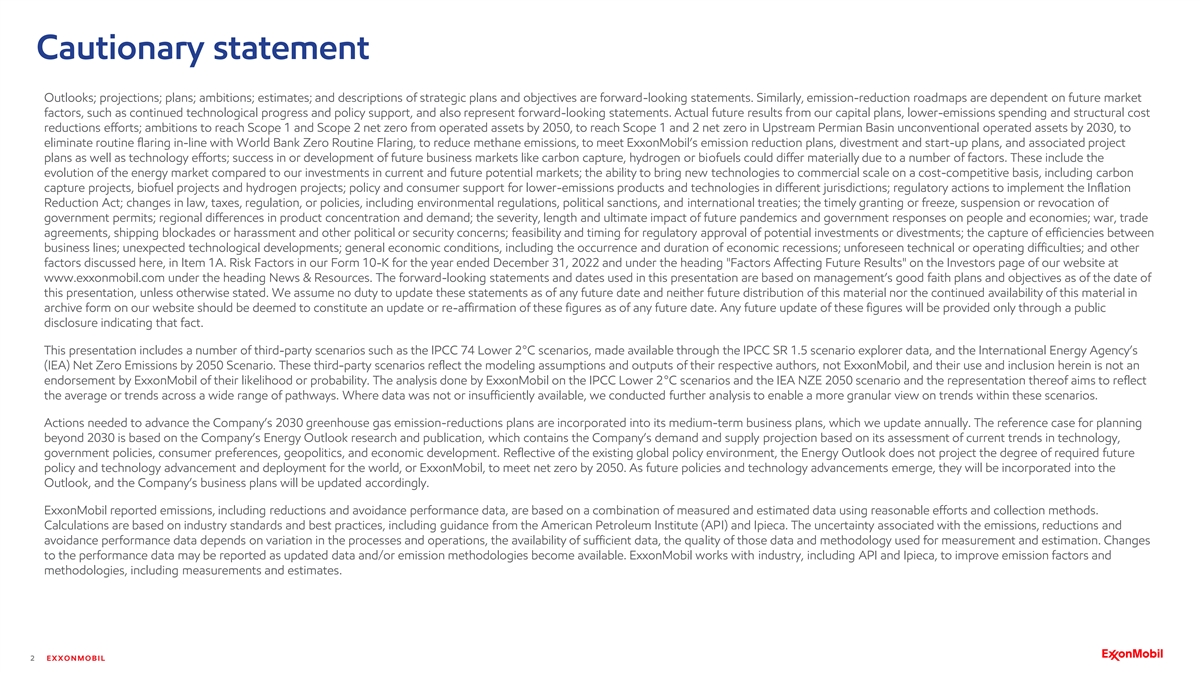 Cautionary statement Outlooks; projections; plans; ambitions; estimates; and descriptions of strategic plans and objectives are forward-looking statements. Similarly, emission-reduction roadmaps are dependent on future market factors, such as continued technological progress and policy support, and also represent forward-looking statements. Actual future results from our capital plans, lower-emissions spending and structural cost reductions efforts; ambitions to reach Scope 1 and Scope 2 net zero from operated assets by 2050, to reach Scope 1 and 2 net zero in Upstream Permian Basin unconventional operated assets by 2030, to eliminate routine flaring in-line with World Bank Zero Routine Flaring, to reduce methane emissions, to meet ExxonMobil’s emission reduction plans, divestment and start-up plans, and associated project plans as well as technology efforts; success in or development of future business markets like carbon capture, hydrogen or biofuels could differ materially due to a number of factors. These include the evolution of the energy market compared to our investments in current and future potential markets; the ability to bring new technologies to commercial scale on a cost-competitive basis, including carbon capture projects, biofuel projects and hydrogen projects; policy and consumer support for lower-emissions products and technologies in different jurisdictions; regulatory actions to implement the Inflation Reduction Act; changes in law, taxes, regulation, or policies, including environmental regulations, political sanctions, and international treaties; the timely granting or freeze, suspension or revocation of government permits; regional differences in product concentration and demand; the severity, length and ultimate impact of future pandemics and government responses on people and economies; war, trade agreements, shipping blockades or harassment and other political or security concerns; feasibility and timing for regulatory approval of potential investments or divestments; the capture of efficiencies between business lines; unexpected technological developments; general economic conditions, including the occurrence and duration of economic recessions; unforeseen technical or operating difficulties; and other factors discussed here, in Item 1A. Risk Factors in our Form 10-K for the year ended December 31, 2022 and under the heading Factors Affecting Future Results on the Investors page of our website at www.exxonmobil.com under the heading News & Resources. The forward-looking statements and dates used in this presentation are based on management’s good faith plans and objectives as of the date of this presentation, unless otherwise stated. We assume no duty to update these statements as of any future date and neither future distribution of this material nor the continued availability of this material in archive form on our website should be deemed to constitute an update or re-affirmation of these figures as of any future date. Any future update of these figures will be provided only through a public disclosure indicating that fact. This presentation includes a number of third-party scenarios such as the IPCC 74 Lower 2°C scenarios, made available through the IPCC SR 1.5 scenario explorer data, and the International Energy Agency’s (IEA) Net Zero Emissions by 2050 Scenario. These third-party scenarios reflect the modeling assumptions and outputs of their respective authors, not ExxonMobil, and their use and inclusion herein is not an endorsement by ExxonMobil of their likelihood or probability. The analysis done by ExxonMobil on the IPCC Lower 2°C scenarios and the IEA NZE 2050 scenario and the representation thereof aims to reflect the average or trends across a wide range of pathways. Where data was not or insufficiently available, we conducted further analysis to enable a more granular view on trends within these scenarios. Actions needed to advance the Company’s 2030 greenhouse gas emission-reductions plans are incorporated into its medium-term business plans, which we update annually. The reference case for planning beyond 2030 is based on the Company’s Energy Outlook research and publication, which contains the Company’s demand and supply projection based on its assessment of current trends in technology, government policies, consumer preferences, geopolitics, and economic development. Reflective of the existing global policy environment, the Energy Outlook does not project the degree of required future policy and technology advancement and deployment for the world, or ExxonMobil, to meet net zero by 2050. As future policies and technology advancements emerge, they will be incorporated into the Outlook, and the Company’s business plans will be updated accordingly. ExxonMobil reported emissions, including reductions and avoidance performance data, are based on a combination of measured and estimated data using reasonable efforts and collection methods. Calculations are based on industry standards and best practices, including guidance from the American Petroleum Institute (API) and Ipieca. The uncertainty associated with the emissions, reductions and avoidance performance data depends on variation in the processes and operations, the availability of sufficient data, the quality of those data and methodology used for measurement and estimation. Changes to the performance data may be reported as updated data and/or emission methodologies become available. ExxonMobil works with industry, including API and Ipieca, to improve emission factors and methodologies, including measurements and estimates. 2 EXXONMOBIL