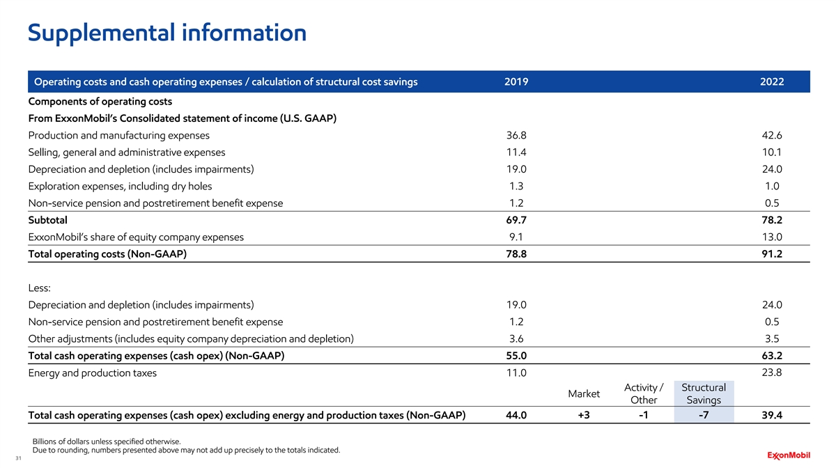 Supplemental information Operating costs and cash operating expenses / calculation of structural cost savings 2019 2022 Components of operating costs From ExxonMobil’s Consolidated statement of income (U.S. GAAP) Production and manufacturing expenses 36.8 42.6 Selling, general and administrative expenses 11.4 10.1 Depreciation and depletion (includes impairments) 19.0 24.0 Exploration expenses, including dry holes 1.3 1.0 Non-service pension and postretirement benefit expense 1.2 0.5 Subtotal 69.7 78.2 ExxonMobil’s share of equity company expenses 9.1 13.0 Total operating costs (Non-GAAP) 78.8 91.2 Less: Depreciation and depletion (includes impairments) 19.0 24.0 Non-service pension and postretirement benefit expense 1.2 0.5 Other adjustments (includes equity company depreciation and depletion) 3.6 3.5 Total cash operating expenses (cash opex) (Non-GAAP) 55.0 63.2 23.8 Energy and production taxes 11.0 Activity / Structural Market Other Savings Total cash operating expenses (cash opex) excluding energy and production taxes (Non-GAAP) 44.0 +3 -1 -7 39.4 Billions of dollars unless specified otherwise. Due to rounding, numbers presented above may not add up precisely to the totals indicated. 31