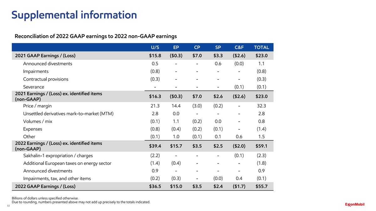 Supplemental information Reconciliation of 2022 GAAP earnings to 2022 non-GAAP earnings U/S EP CP SP C&F TOTAL 2021 GAAP Earnings / (Loss) $15.8 ($0.3) $7.0 $3.3 ($2.6) $23.0 Announced divestments 0.5 - - 0.6 (0.0) 1.1 Impairments (0.8) - - - - (0.8) Contractual provisions (0.3) - - - - (0.3) Severance - - - - (0.1) (0.1) 2021 Earnings / (Loss) ex. identified items $16.3 ($0.3) $7.0 $2.6 ($2.6) $23.0 (non-GAAP) Price / margin 21.3 14.4 (3.0) (0.2) - 32.3 Unsettled derivatives mark-to-market (MTM) 2.8 0.0 - - - 2.8 Volumes / mix (0.1) 1.1 (0.2) 0.0 - 0.8 Expenses (0.8) (0.4) (0.2) (0.1) - (1.4) Other (0.1) 1.0 (0.1) 0.1 0.6 1.5 2022 Earnings / (Loss) ex. identified items $39.4 $15.7 $3.5 $2.5 ($2.0) $59.1 (non-GAAP) Sakhalin-1 expropriation / charges (2.2) - - - (0.1) (2.3) Additional European taxes on energy sector (1.4) (0.4) - - - (1.8) Announced divestments 0.9 - - - - 0.9 Impairments, tax, and other items (0.2) (0.3) - (0.0) 0.4 (0.1) 2022 GAAP Earnings / (Loss) $36.5 $15.0 $3.5 $2.4 ($1.7) $55.7 Billions of dollars unless specified otherwise. Due to rounding, numbers presented above may not add up precisely to the totals indicated. 32