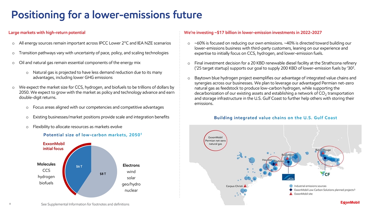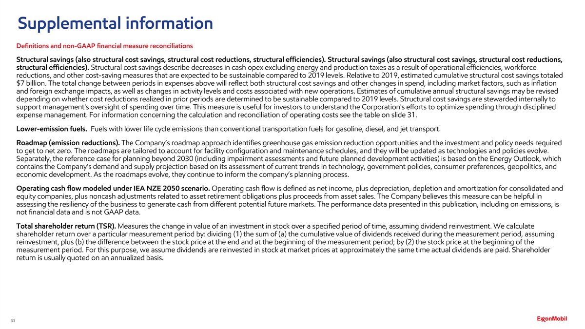 Supplemental information Definitions and non-GAAP financial measure reconciliations Structural savings (also structural cost savings, structural cost reductions, structural efficiencies). Structural savings (also structural cost savings, structural cost reductions, structural efficiencies). Structural cost savings describe decreases in cash opex excluding energy and production taxes as a result of operational efficiencies, workforce reductions, and other cost-saving measures that are expected to be sustainable compared to 2019 levels. Relative to 2019, estimated cumulative structural cost savings totaled $7 billion. The total change between periods in expenses above will reflect both structural cost savings and other changes in spend, including market factors, such as inflation and foreign exchange impacts, as well as changes in activity levels and costs associated with new operations. Estimates of cumulative annual structural savings may be revised depending on whether cost reductions realized in prior periods are determined to be sustainable compared to 2019 levels. Structural cost savings are stewarded internally to support management's oversight of spending over time. This measure is useful for investors to understand the Corporation's efforts to optimize spending through disciplined expense management. For information concerning the calculation and reconciliation of operating costs see the table on slide 31. Lower-emission fuels. Fuels with lower life cycle emissions than conventional transportation fuels for gasoline, diesel, and jet transport. Roadmap (emission reductions). The Company’s roadmap approach identifies greenhouse gas emission reduction opportunities and the investment and policy needs required to get to net zero. The roadmaps are tailored to account for facility configuration and maintenance schedules, and they will be updated as technologies and policies evolve. Separately, the reference case for planning beyond 2030 (including impairment assessments and future planned development activities) is based on the Energy Outlook, which contains the Company’s demand and supply projection based on its assessment of current trends in technology, government policies, consumer preferences, geopolitics, and economic development. As the roadmaps evolve, they continue to inform the company’s planning process. Operating cash flow modeled under IEA NZE 2050 scenario. Operating cash flow is defined as net income, plus depreciation, depletion and amortization for consolidated and equity companies, plus noncash adjustments related to asset retirement obligations plus proceeds from asset sales. The Company believes this measure can be helpful in assessing the resiliency of the business to generate cash from different potential future markets. The performance data presented in this publication, including on emissions, is not financial data and is not GAAP data. Total shareholder return (TSR). Measures the change in value of an investment in stock over a specified period of time, assuming dividend reinvestment. We calculate shareholder return over a particular measurement period by: dividing (1) the sum of (a) the cumulative value of dividends received during the measurement period, assuming reinvestment, plus (b) the difference between the stock price at the end and at the beginning of the measurement period; by (2) the stock price at the beginning of the measurement period. For this purpose, we assume dividends are reinvested in stock at market prices at approximately the same time actual dividends are paid. Shareholder return is usually quoted on an annualized basis. 33